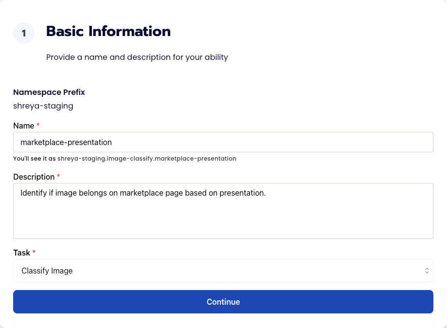 Fill out basic information about the ability such as its name and the description of the task itself. Since we are classifying an image, select the Task Type as Classify Image.