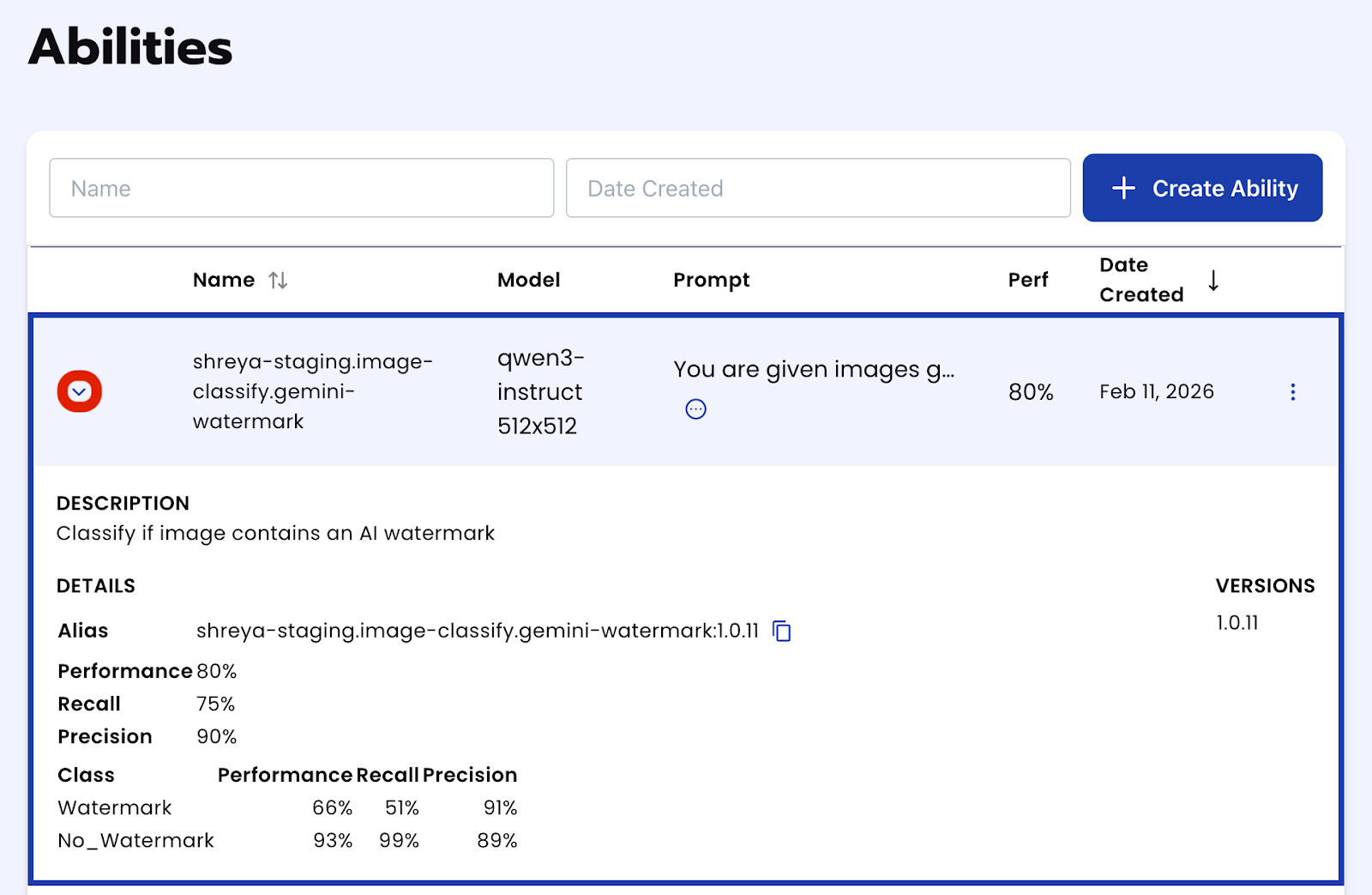 Having the model describe what you are trying to classify in the image can help improve the prompt. To do this, select the Create Ability button and follow the same steps as above but instead of setting the Task Type to be Classify Image, change it to Describe Image. From there, upload an image containing the feature you are classifying and explain the task in the prompt.
