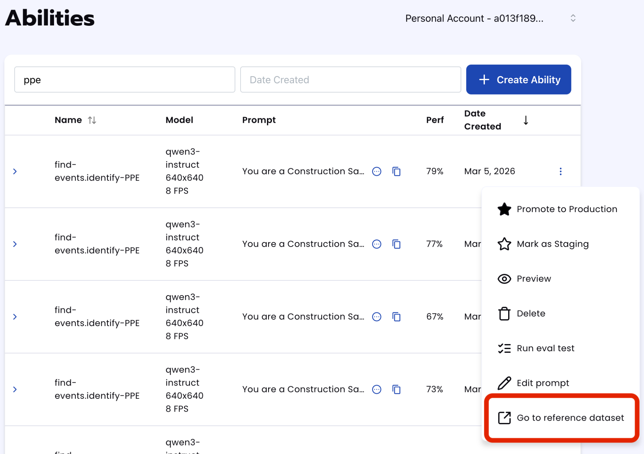 In addition to the performance, recall, and precision percentages on the abilities tab, you can see a visualization of what the model predicted by revisiting the dataset. Click on the three dots and select “Go to reference dataset”.