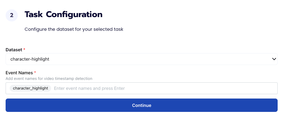 To configure the task, we need to select a dataset for the specific task. If you have already uploaded your videos in a dataset simply select the name of your dataset. However, if you haven’t already done so then select <New Dataset> and upload your videos, label them by identifying each type of shot in the videos, and create the label character_highlight in Event Names.