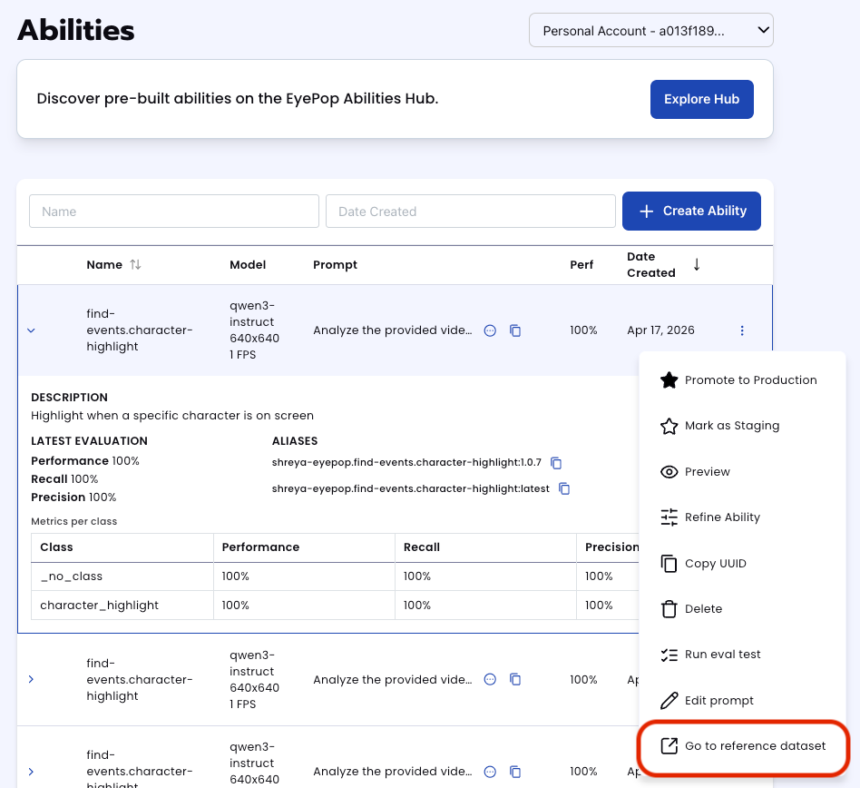 In addition to the performance, recall, and precision percentages on the abilities tab, you can see a visualization of what the model predicted by revisiting the dataset. Click on the three dots and select “Go to reference dataset”.