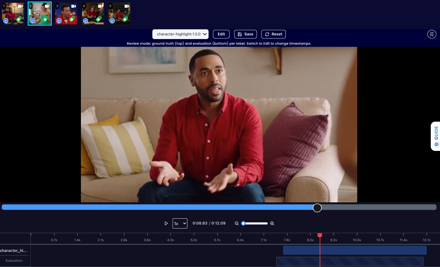 For example, during a sitcom scene or a movie edit, a specific segment of footage should be flagged with the label character_highlight if it clearly shows the target character, such as a man wearing a bright red shirt. This includes wide shots where he is standing with others, action shots, and solo close-ups of his face.