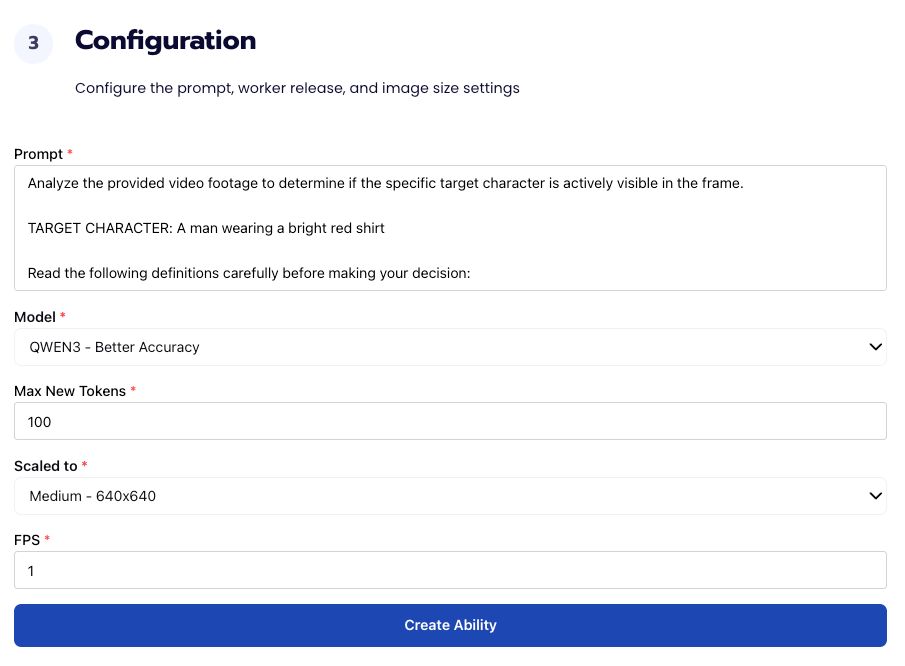 Fill out basic information about the ability such as its name and the description of the task itself. Since we are classifying events in a video, select the Task Type as Find Events.