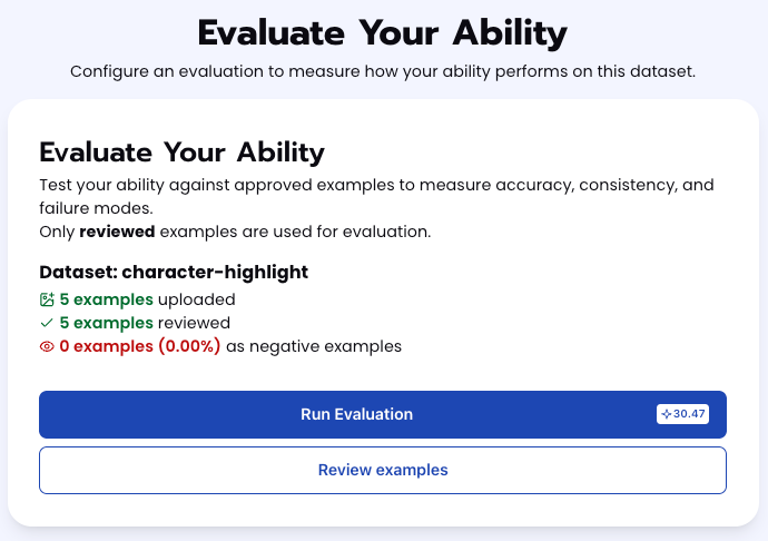 All evaluations can be reviewed in the Abilities tab by clicking the dropdown arrow next to the associated ability-alias. Evaluations can take around 15-20 minutes to complete based on the size of the dataset.