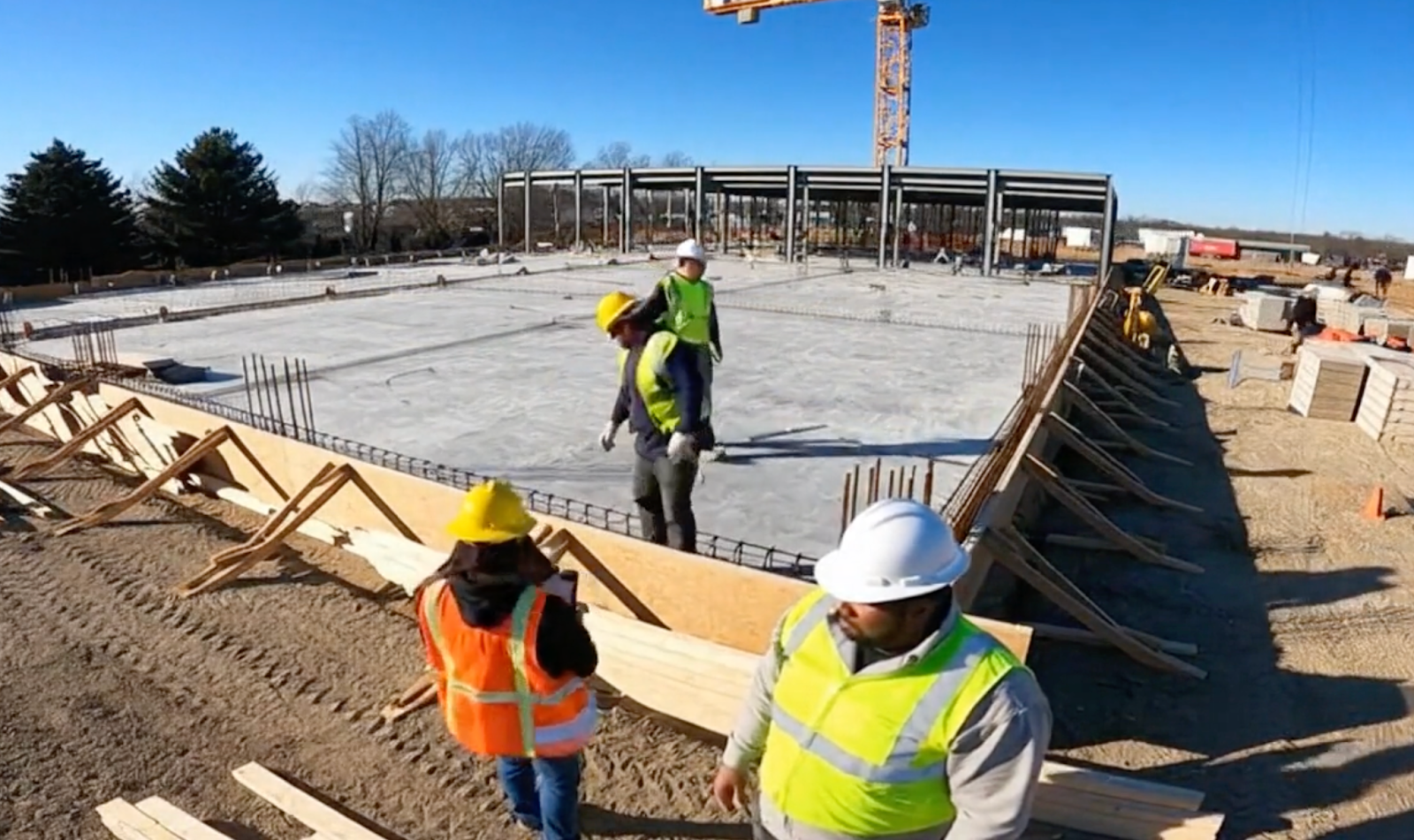 Based on a strong prompt, it should output a thorough description: "Construction workers in safety vests and hard hats are on a site under clear blue skies. Two workers in the foreground gesture and move slightly. Two others work on a concrete slab, bending over rebar. A large crane stands in the background near a partially built steel frame. Wooden planks and construction materials lie on the ground. Shadows stretch across the dirt and concrete. Trees line the horizon. The scene is brightly lit by direct sunlight. No visible text or numbers."
