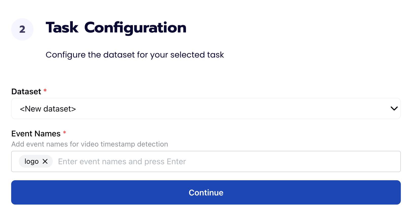 To configure the task, we need to select a dataset for the specific task. If you have already uploaded your videos in a dataset simply select the name of your dataset. However, if you haven’t already done so then select <New Dataset> and upload your videos, label them by identifying when the brand logo appears in the broadcast, and create a label logo in Event Names.