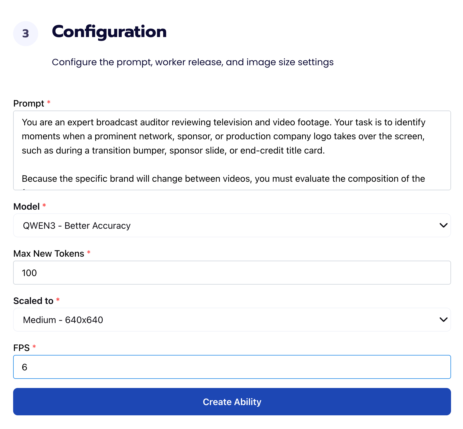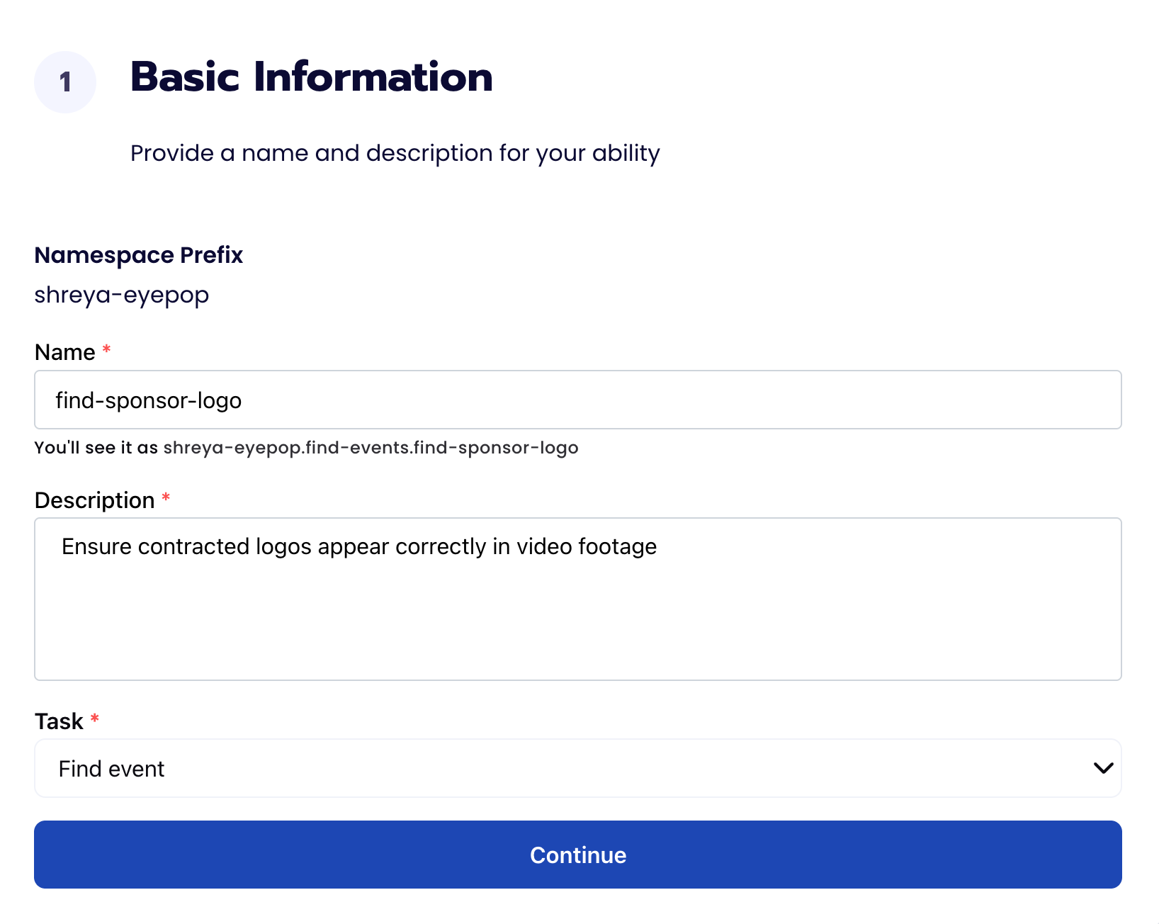 Fill out basic information about the ability such as its name and the description of the task itself. Since we are classifying events in a video, select the Task Type as Find Events.