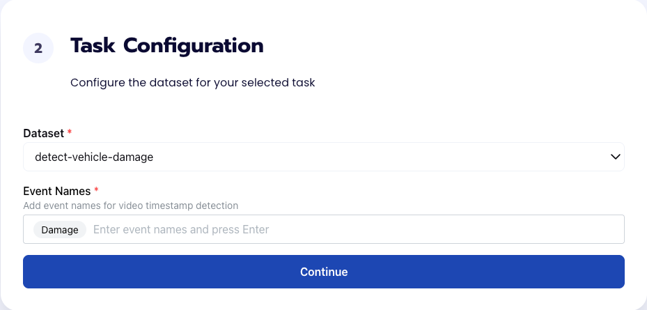 To configure the task, we need to select a dataset for the specific task. If you have already uploaded your videos in a dataset simply select the name of your dataset. However, if you haven’t already done so then select <New Dataset>, create a label Damage, upload your videos, and label them by identifying where the damaged parts of the vehicle appear in the video.