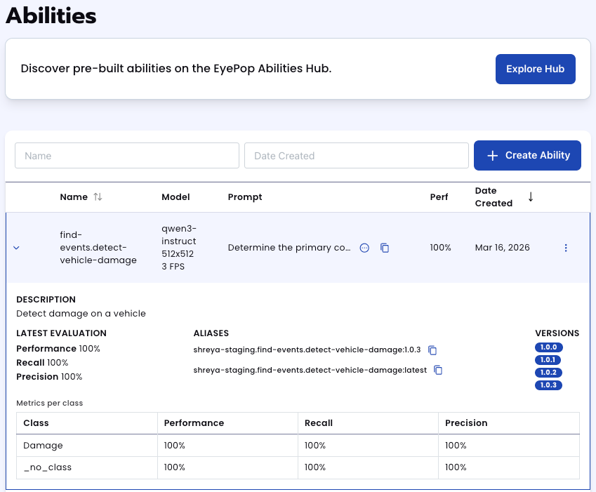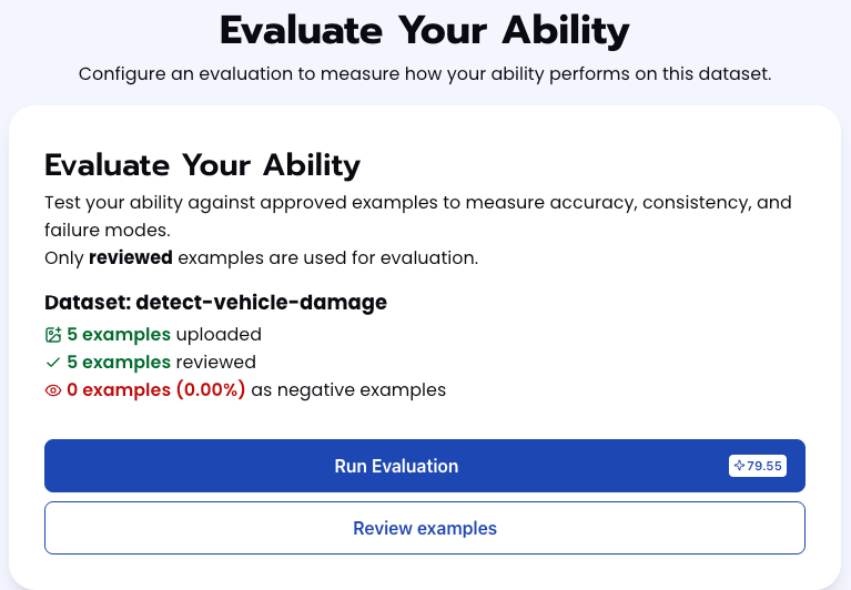 All evaluations can be reviewed in the Abilities tab by clicking the dropdown arrow next to the associated ability-alias. Evaluations can take around 15-20 minutes to complete based on the size of the dataset.