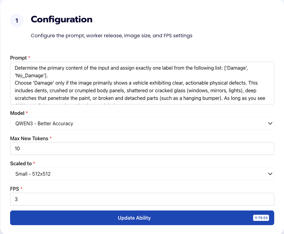We chose Max New Tokens to be 10 since outputting the label Damage won’t take too many new tokens. In addition, we use an FPS of 3 to maximize efficiency; we are simply looking at damages on a parked car so we don’t need a high FPS rate since that would feed the model redundant images. An FPS of 3 will balance latency with visual detail to catch all damages.