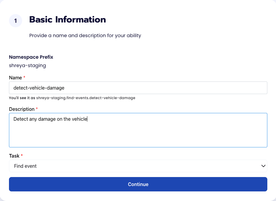 Fill out basic information about the ability such as its name and the description of the task itself. Since we are classifying an image, select the Task Type as Find Events.